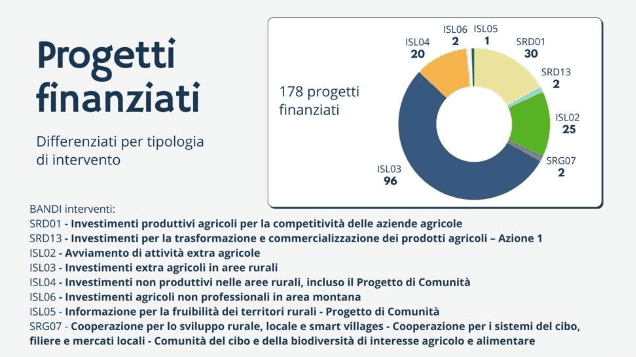 I progetti realizzati includono l’apertura di nuove imprese di commercio, artigianato, di servizio, specialmente giovanili; l’acquisto di attrezzatura e il miglioramento infrastrutturale per il potenziamento delle aziende agricole, di trasformazione ed extra agricole nel territorio; nuovi servizi attivati nei Comuni nonché aiuti per i “custodi del territorio” e, infine, la creazione di gruppi di cooperazione.